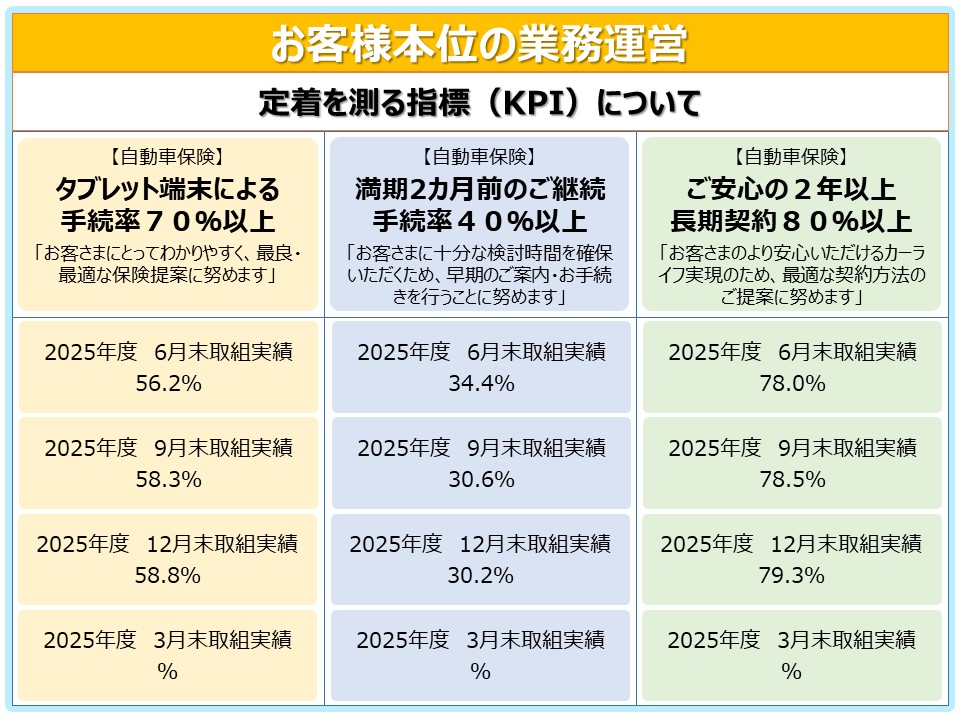 当社は、お客さまのご意向やお車の使用状況など正確に確認・把握し、社会環境の変化(自然災害など)も考慮しながら、お客さまにとって最良・最適なご提案を実施いたします。分かりやすいご説明を行うために各種手続きは余裕を持ったスケジュールでご案内するよう努めます。