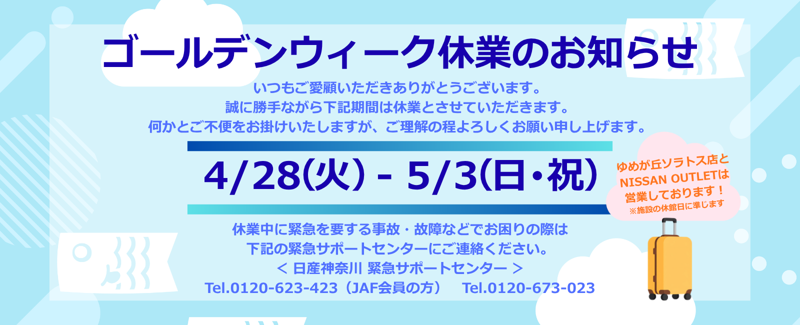 ※ゆめが丘ソラトス店・NISSAN OUTLETは、火曜日・水曜日も営業しております。(年中無休・施設休館日に準ずる) ※法人営業部と中古車店舗については店舗ページのカレンダーをご確認ください。