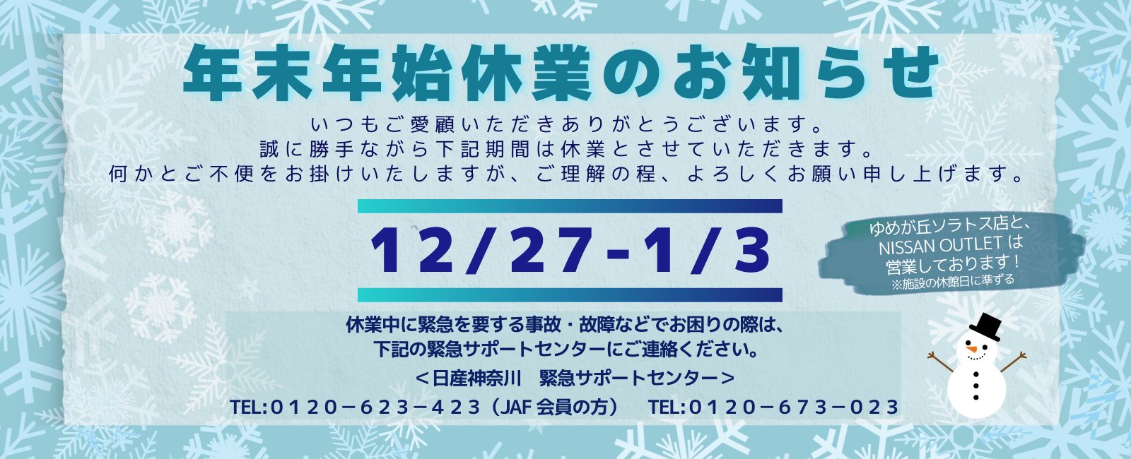 ※ゆめが丘ソラトス店は、火曜日・水曜日も営業しております。(年中無休・ゆめが丘ソラトスの休館日に準ずる) ※法人営業部と中古車店舗については店舗ページのカレンダーをご確認ください。